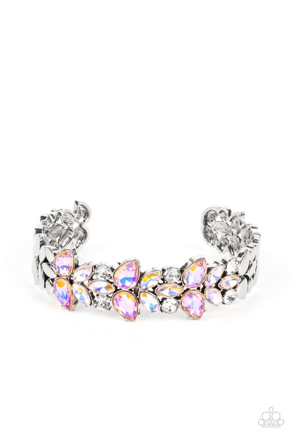 Iridescent coral teardrop and iridescent peach marquise gems converge with classic white rhinestones to create a subtle floral motif across the front of a silver cuff. The prismatic accents add an air of mystery to the piece, while smooth flattened silver discs border the gleaming gems in a high sheen finish. Due to its prismatic palette, color may vary.
