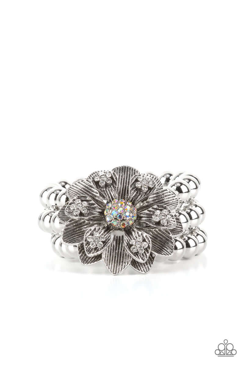 A daring oversized silver flower is composed of petals lined in antiqued silver and dotted with glistening dainty white rhinestones. A sphere of dainty iridescent rhinestones creates the center of the flower as it sits atop a trio of shiny silver beaded stretchy bands around the wrist for a dramatically whimsical look.