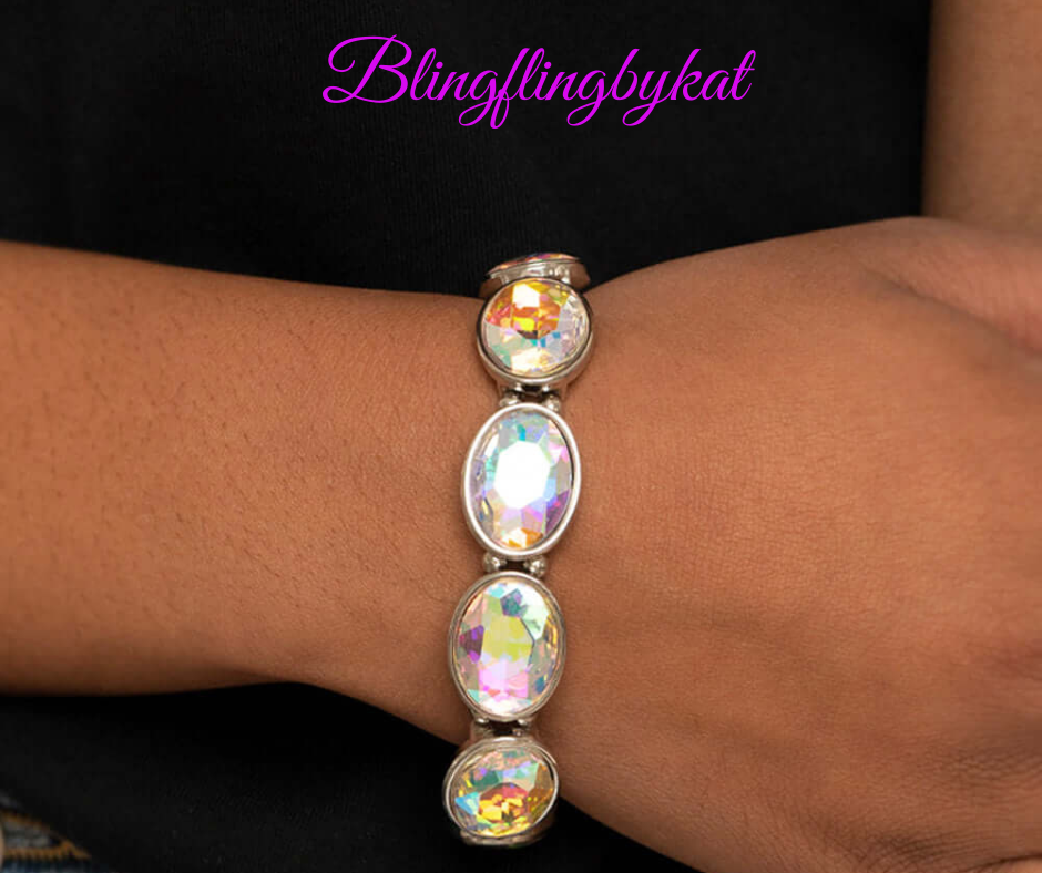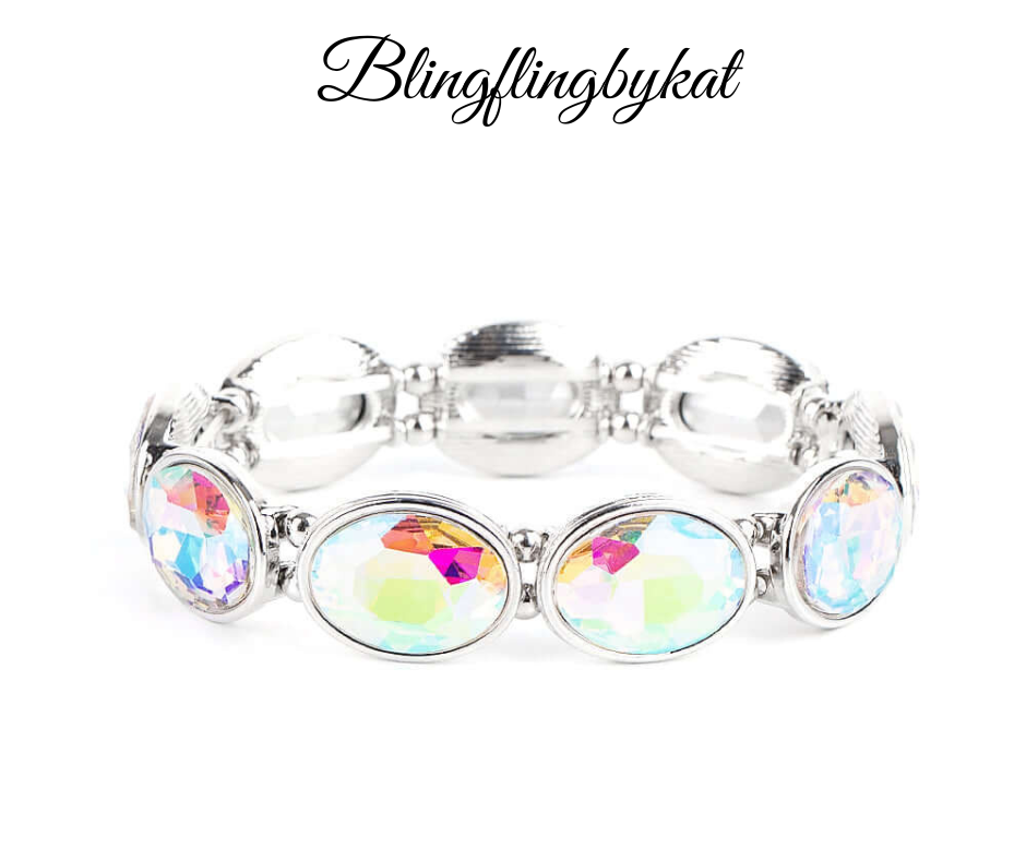 Glittery iridescent gems are pressed into sleek silver frames. Infused with dainty silver beads, the sparkly frames are threaded along stretchy bands for a glamorous look around the wrist.