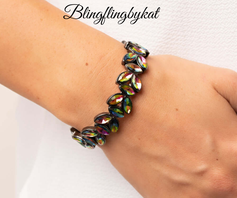Featuring a stellar oil spill finish, trios of marquise cut rhinestones delicately join into leafy gunmetal frames along a stretchy band, creating a refined display around the wrist.