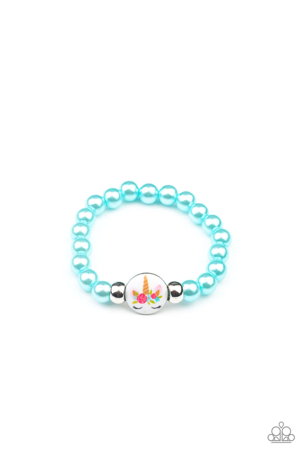 Pack of ten bracelets in assorted colors and shapes with a retail price of $1 each. Crowned with a floral bouquet, a unicorn with fluttering eyelashes adorns a white metallic disc. The stretchy beaded bracelets vary in springtime colors of blue, hot pink, light pink, and green.