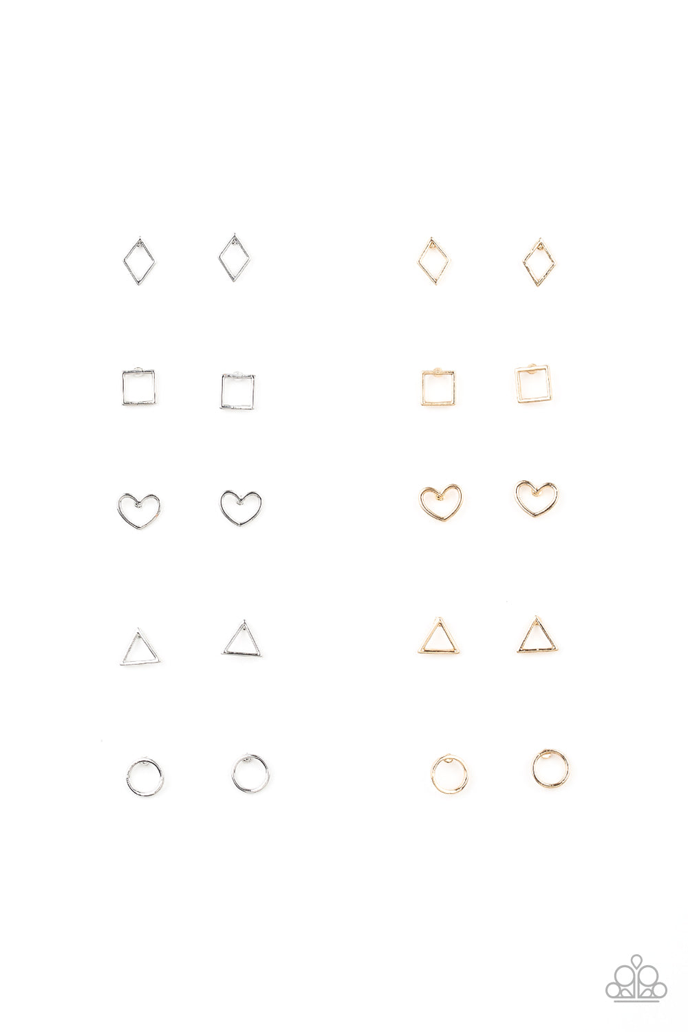 Ten pairs of earrings in assorted colors and shapes to be retailed at $1 per pair. Featuring gold or silver, the shapes include hearts, circles, squares, or triangle frames. Earrings attach to standard post fittings.