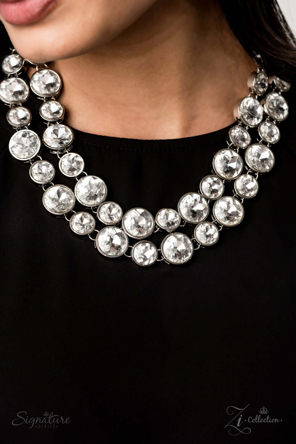 Two rows of dramatically oversized rhinestones sparkle blindingly along the collar. The alternating sizes of the gems give this showstopper some exaggerated depth and dazzle. Features an adjustable clasp closure.