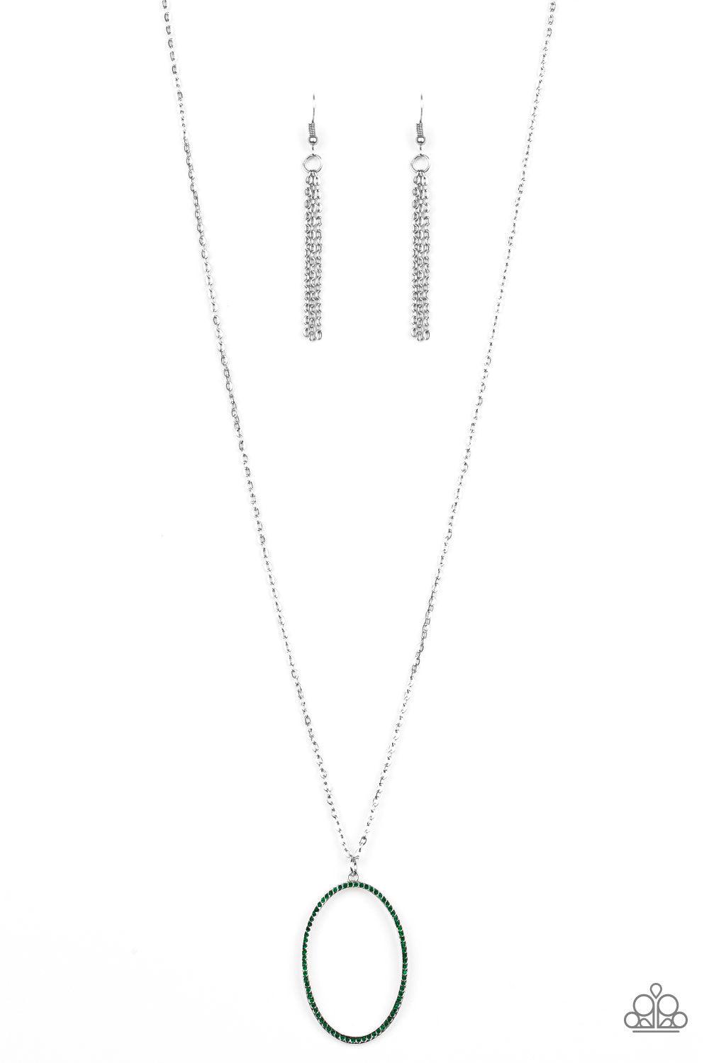 Encrusted in glassy green rhinestones, an airy silver hoop swings from the bottom of a lengthened silver chain for a refined flair. Features an adjustable clasp closure.