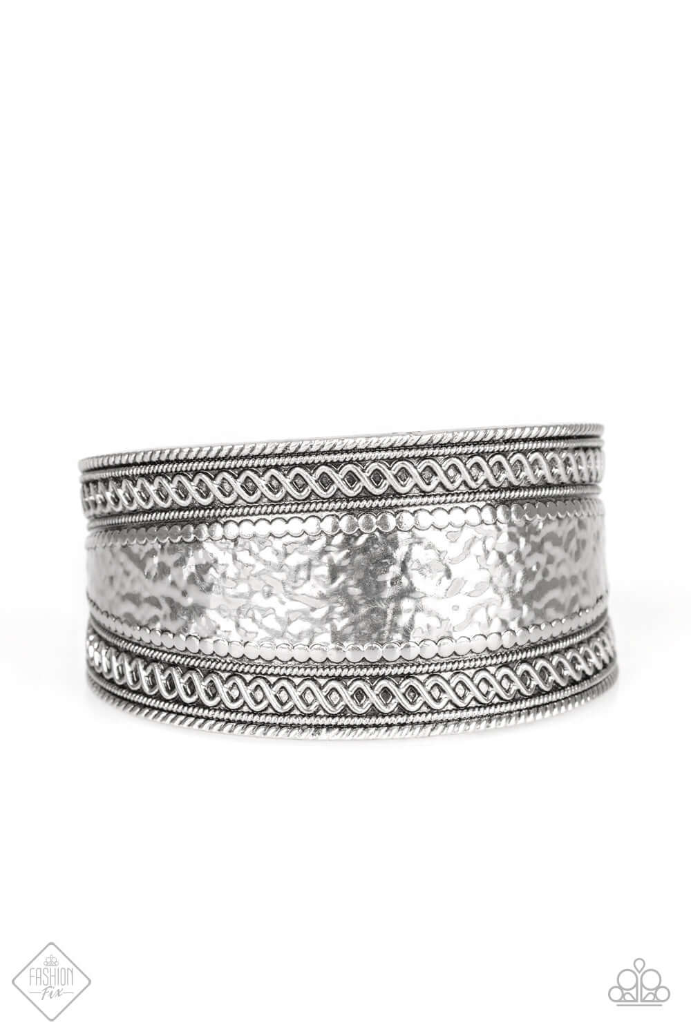 Hammered, studded, and embossed in tribal inspired textures, a thick silver cuff curls around the wrist for an artisan inspired look.