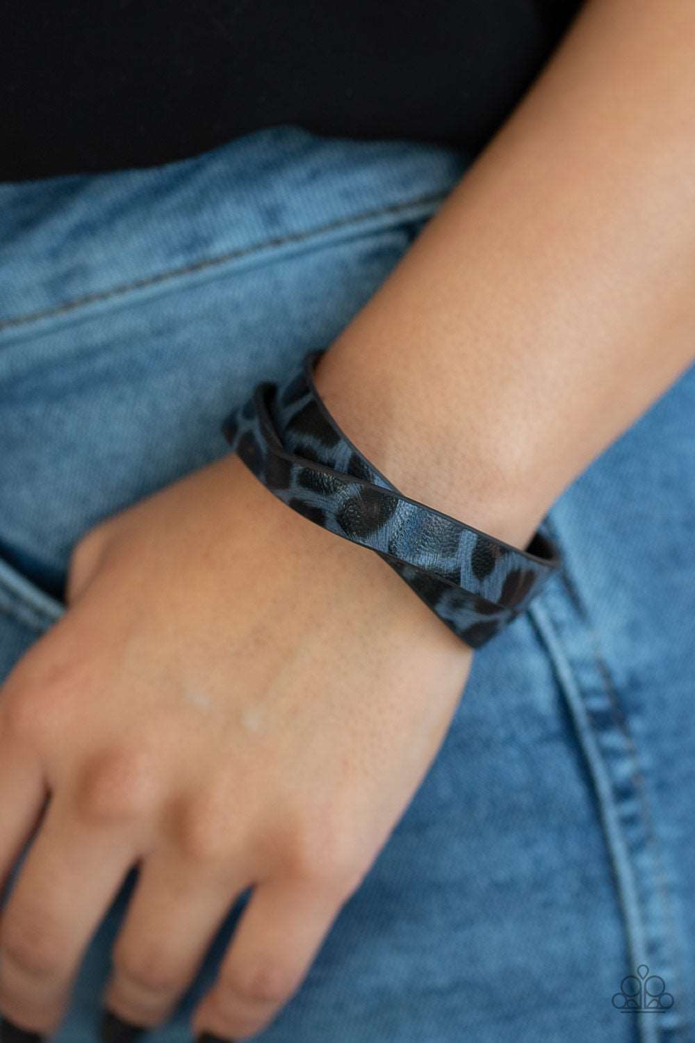 Featuring a blue and black cheetah pattern, a strip of black leather double wraps around the wrist for a wild look. Features an adjustable snap closure.