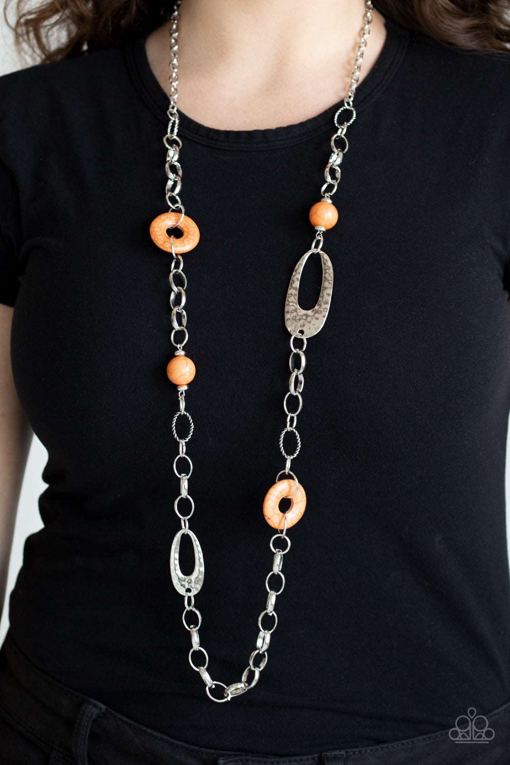 A compilation of refreshing orange stone beads, silver rings, and hammered silver accents connect across the chest for an artisan flair. Features an adjustable clasp closure.