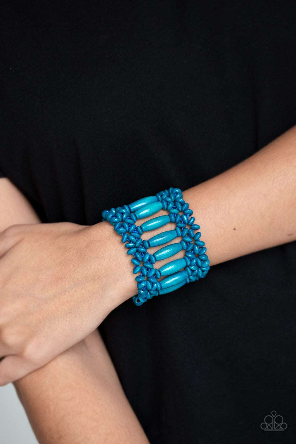 A collection of blue wooden beads are threaded along stretchy bands, coalescing into a vivacious beaded palette for a summery look.