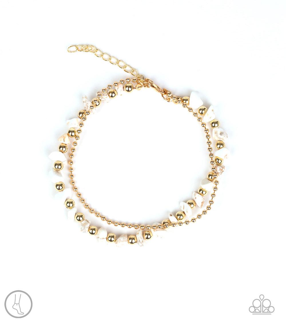 Infused with a dainty strand of gold ball chain, a collection of shimmery gold beads and pieces of white rock are threaded along an invisible wire around the ankle for a summery look. Features an adjustable clasp closure.