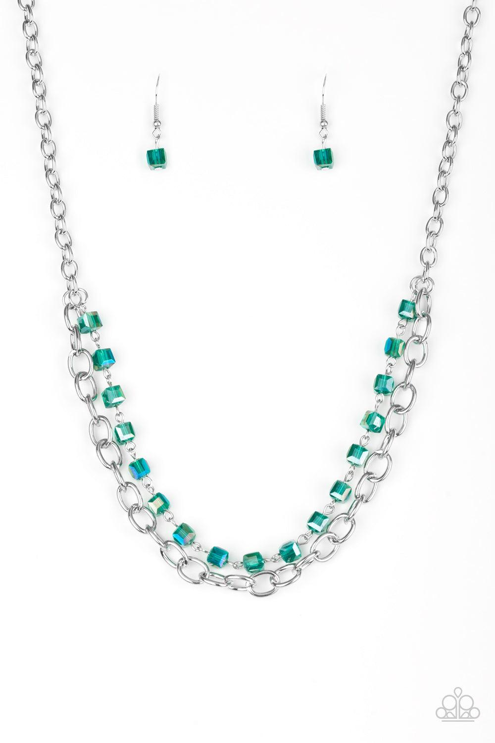 A strand of iridescent green crystal-like cube beading joins a classic strand of silver chain below the collar, creating refined layers. Features an adjustable clasp closure.