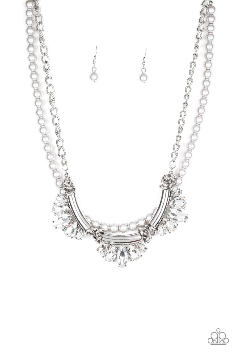 A classic strand of silver pearls and dramatic silvery chain drape below the collar. Infused with heavy metal accents, teardrop and marquise cut white rhinestone frames connect into a show-stopping fringe. Features an adjustable clasp closure.
