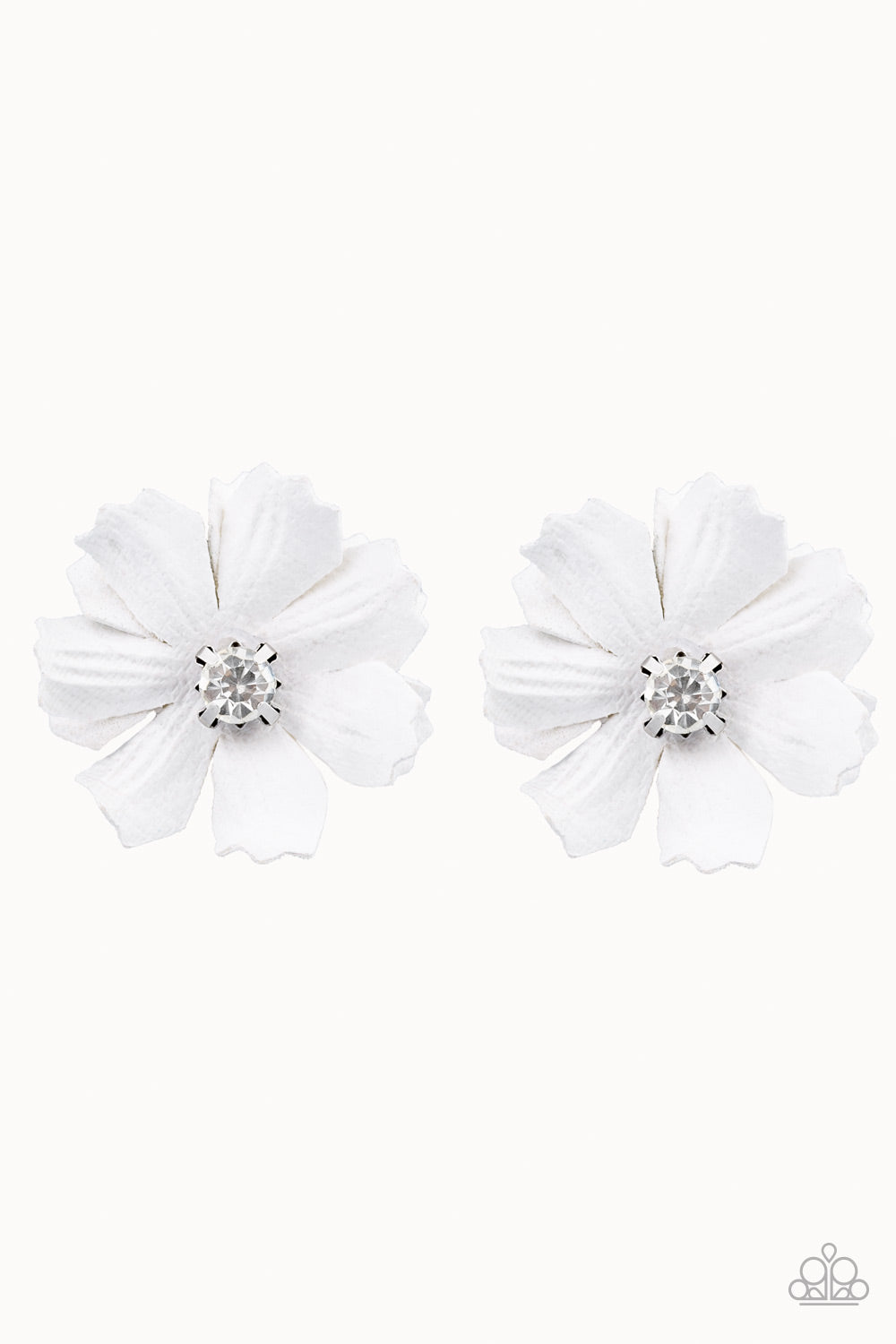 Papery white petals bloom from a white rhinestone center, creating a dainty blossom. Each flower features a standard hair clip on the back.