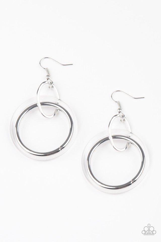 A shimmery silver hoop and clear hoop swing from the bottom of a glistening silver fitting, creating an edgy lure. Earring attaches to a standard fishhook fitting.