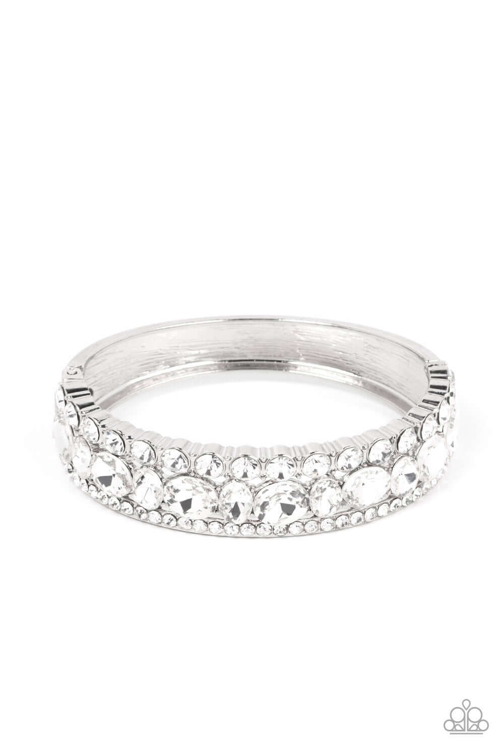 Three blinding rows of mismatched white rhinestones dramatically stack across the wrist, coalescing into a majestic bangle-like centerpiece. Features a hinged closure.