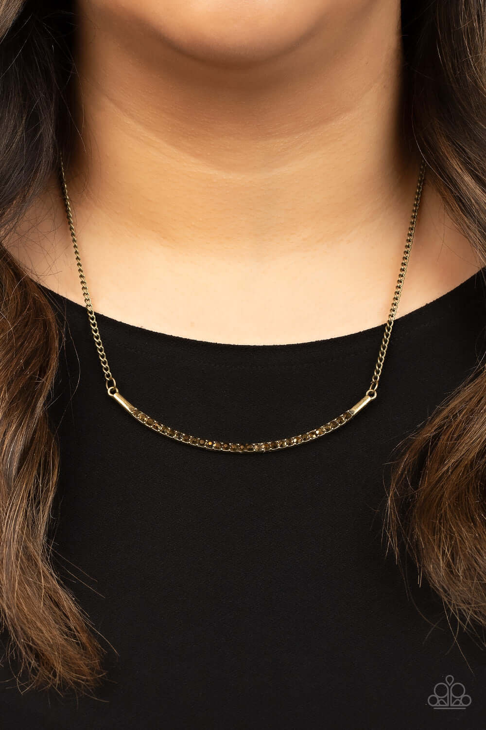 Encrusted in glitzy aurum rhinestones, a curved brass bar bows below the collar for a smoldering style. Features an adjustable clasp closure.
