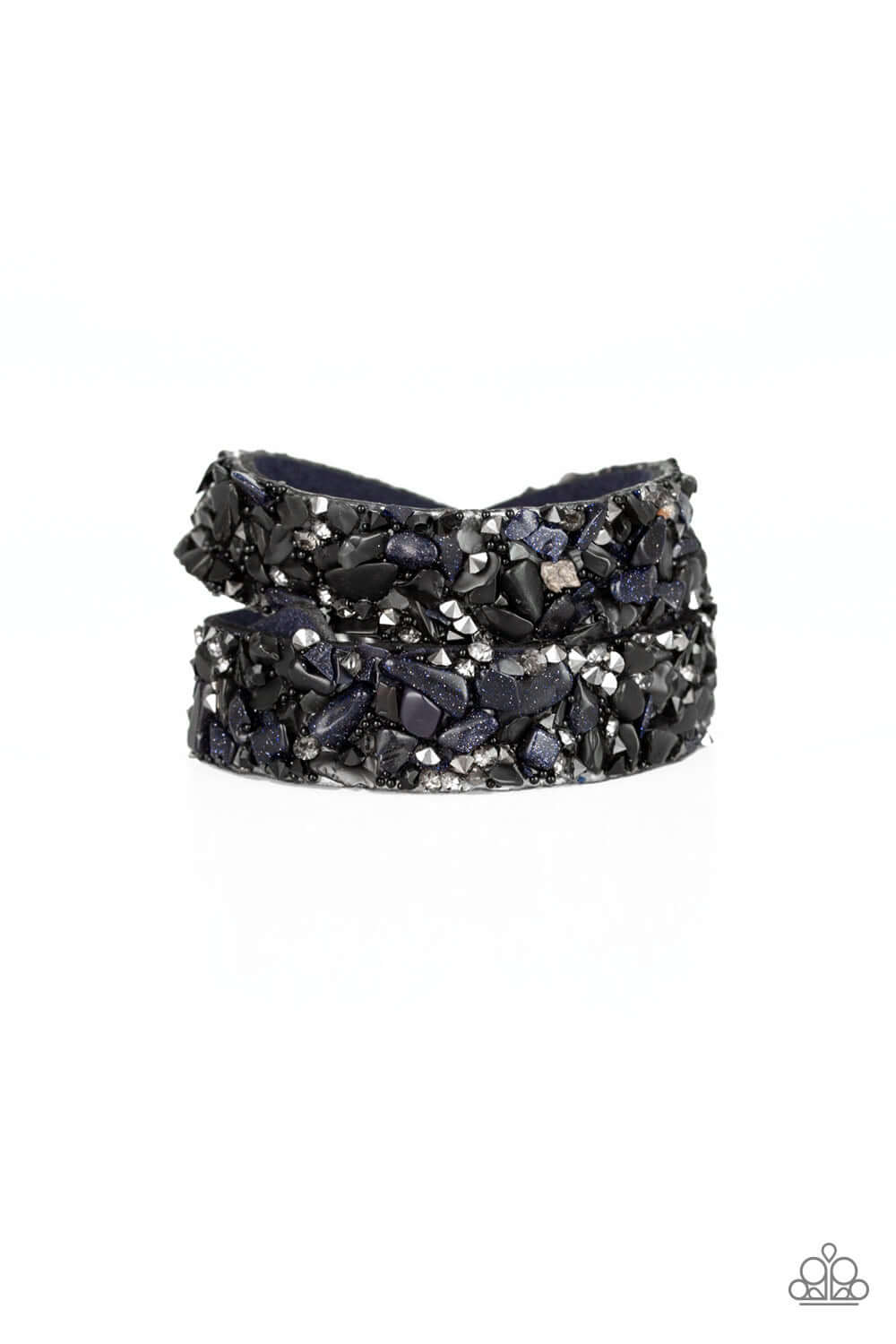 A collection of crushed rocks, smoky and hematite rhinestone prisms are sprinkled across a blue suede band for a seasonal look. The elongated band allows for a trendy double wrap design. Features an adjustable snap closure.