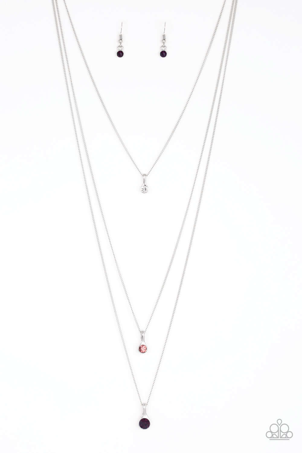 Gradually increasing in size as they drip down the chest, a trio of white, light purple and purple rhinestone pendants trickle from the bottoms of layered silver chains for a delicate ombre effect. Features an adjustable clasp closure.