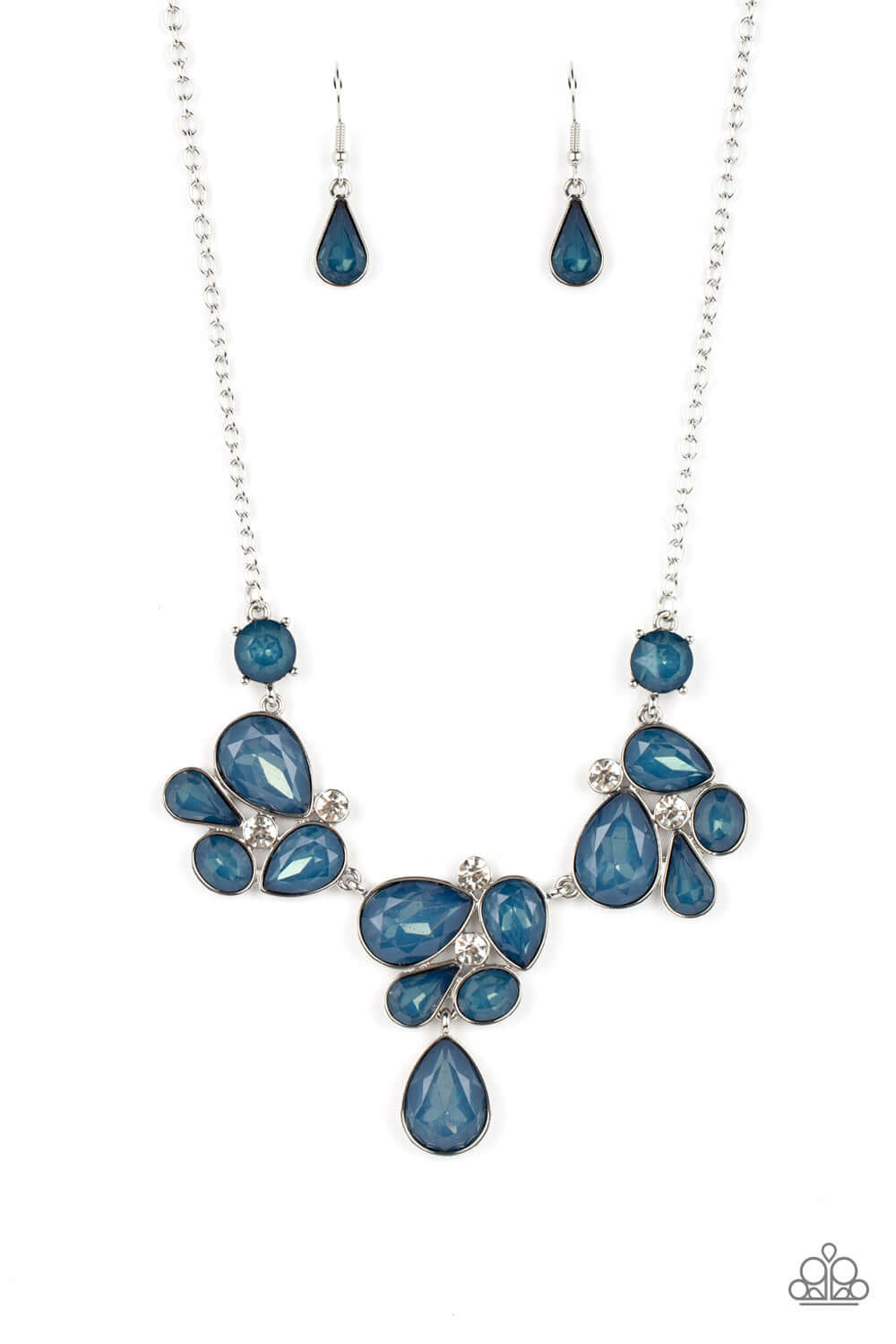 Draped elegantly across the chest, clusters of geometric blue gems, brushed in the fall Pantone® of Midnight, gather around sparkling white rhinestones, creating a bright and beautiful pattern. Features an adjustable clasp closure.