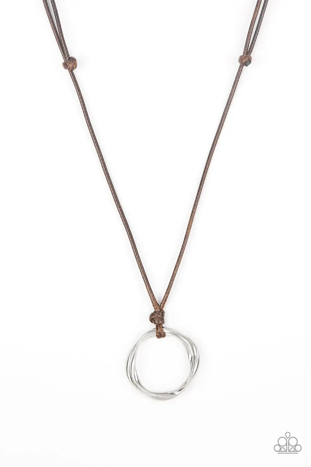 Shiny brown cording knots around two twisted silver hoops, creating a rustic pendant. Features an adjustable sliding knot closure.
