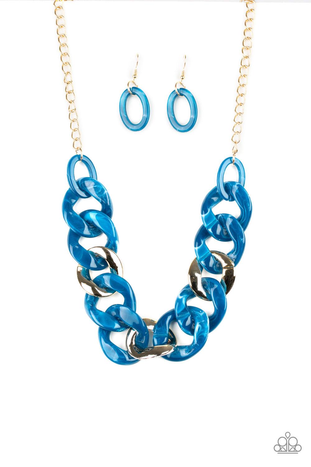 Featuring a faux marble finish, smoky blue acrylic links connect with shiny metallic links below the collar for a colorful statement-making look. Features an adjustable clasp closure.