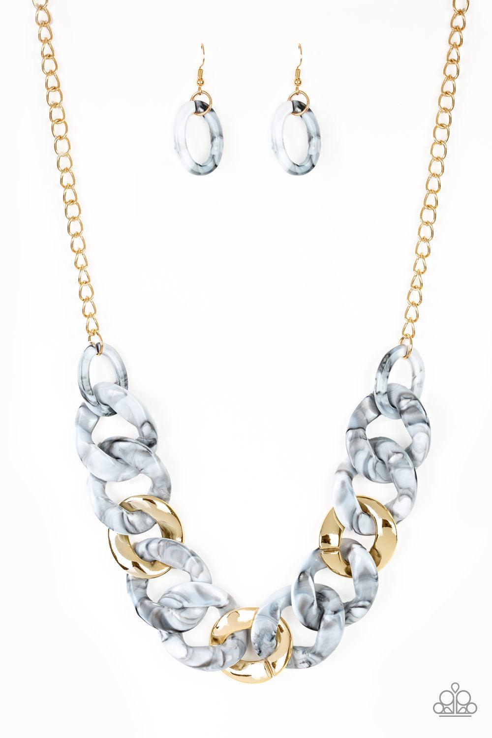 Featuring a faux marble finish, smoky white acrylic links connect with shiny metallic links below the collar for a colorful statement-making look. Features an adjustable clasp closure.