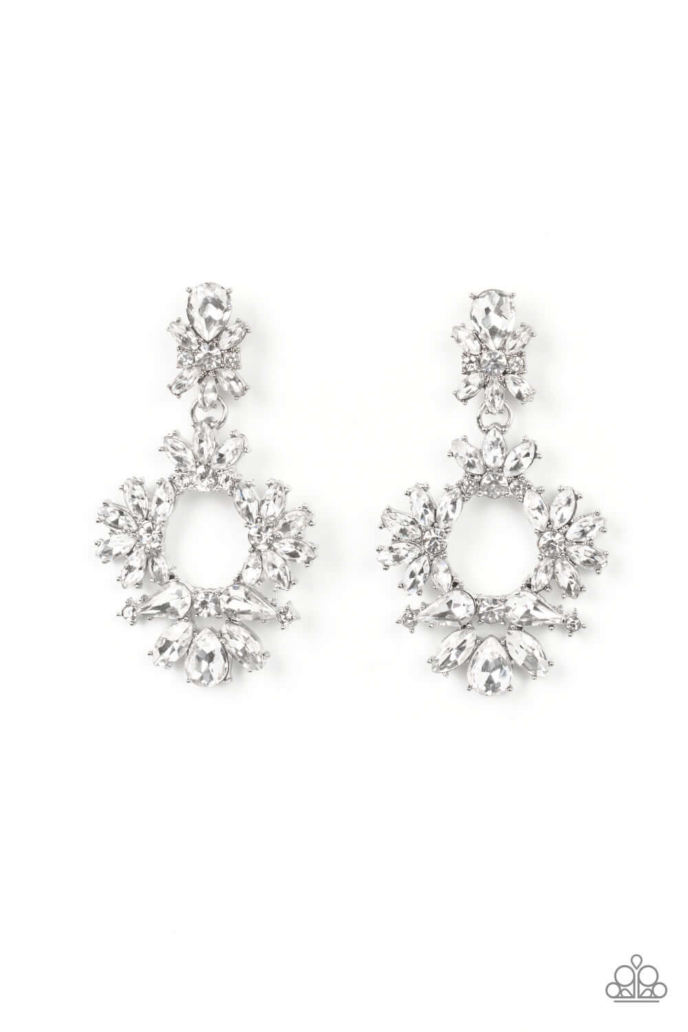 Ablaze with a mismatched assortment of brilliant white rhinestones, a stunning wreath swings from the bottom of a dainty white rhinestone fitting for a jaw-dropping dazzle. Earring attaches to a standard post fitting.