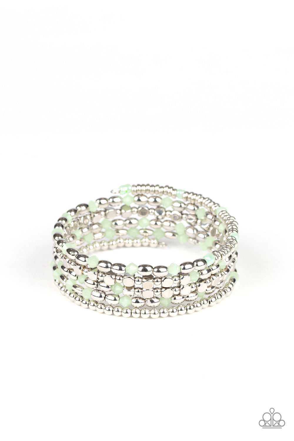 A collection of opaque green crystal-like beads and shimmery silver accents are threaded along a coiled wire to create a whimsical infinity wrap style bracelet around the wrist.