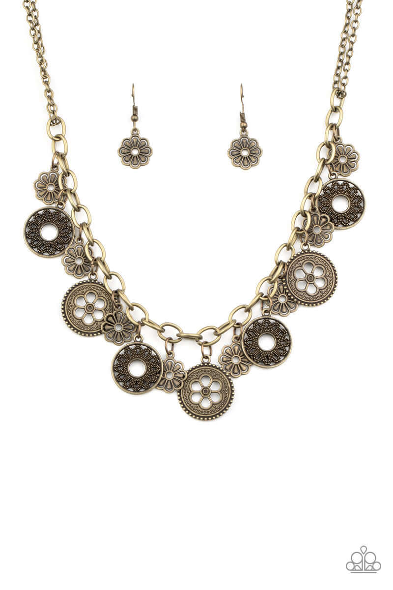 A collection of antiqued floral charms dangles from a thick brass chain, creating a whimsical fringe below the collar. Features an adjustable clasp closure.