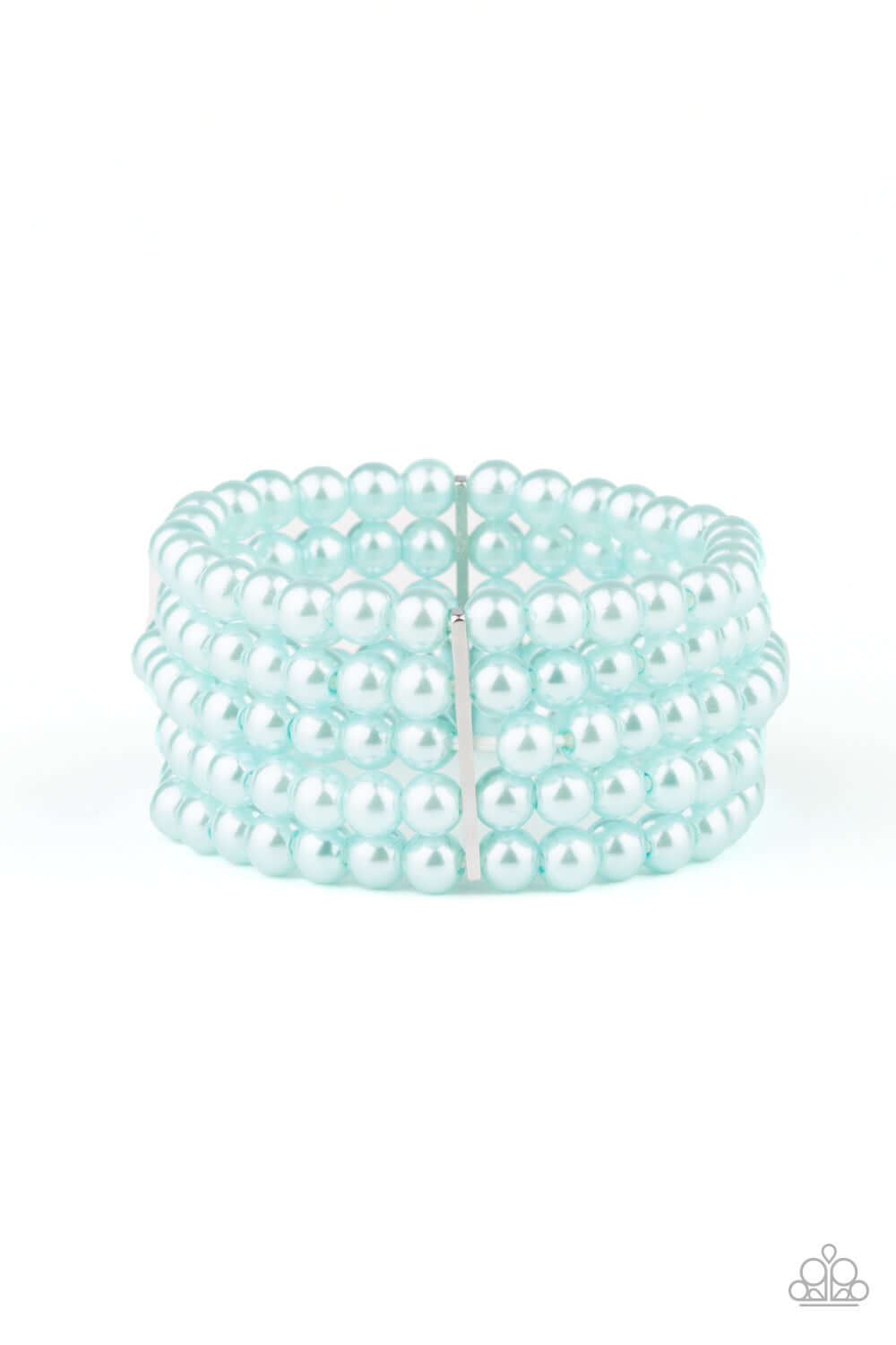 Threaded through glistening silver fittings, strand after strand of dainty blue pearls are threaded along stretchy bands around the wrist for a timelessly stacked look.
