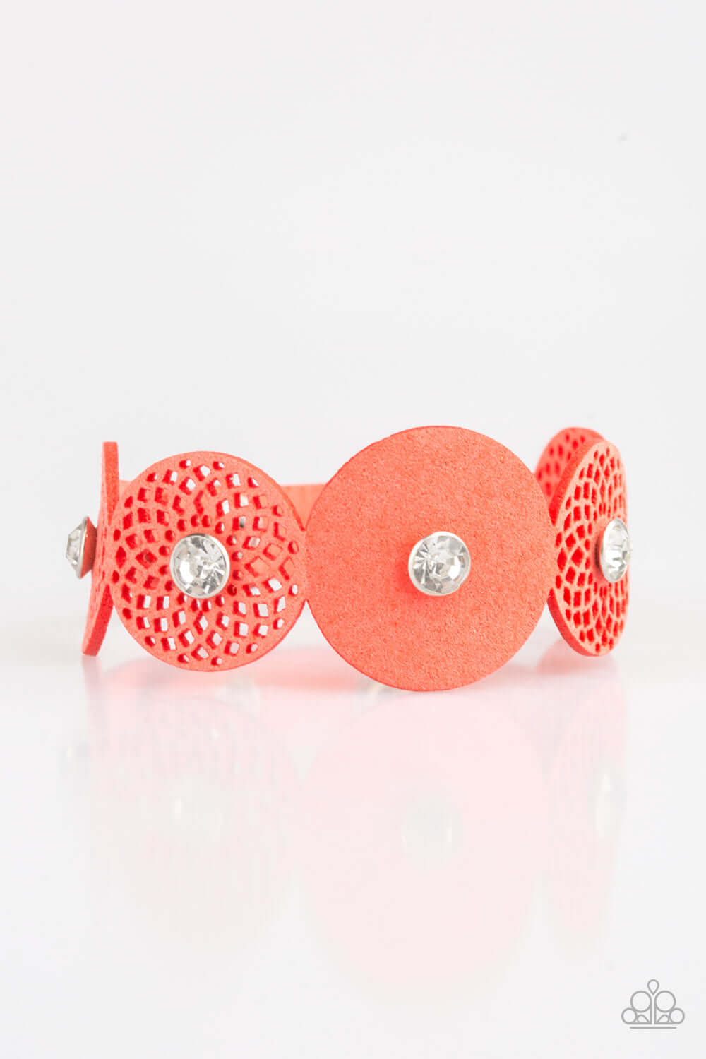 Dotted with white rhinestone centers, round coral suede frames join across the wrist for a whimsical look. Features an adjustable snap closure.