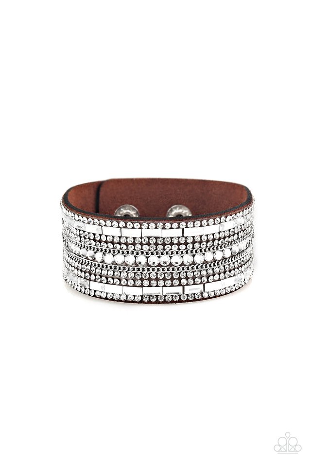 Featuring classic round and edgy emerald style cuts, glittery white rhinestones and glistening silver chains are encrusted along bands of brown suede for a sassy look. Features an adjustable snap closure.
