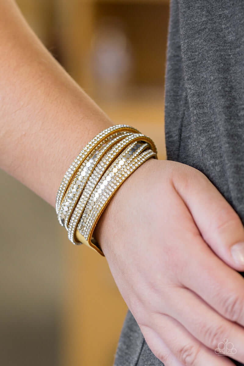 Encrusted in rows of glassy white rhinestones and flat silver studs, three strands of yellow suede wrap around the wrist for a sassy look. The elongated band allows for a trendy double wrap around the wrist. Features an adjustable snap closure.