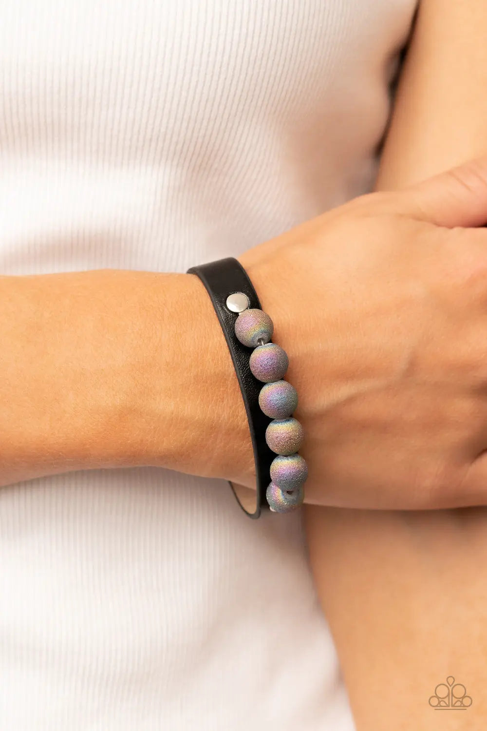 Brushed in shimmering glitter, multicolored beads are infused with swirls of blue, green, purple, and yellow. Threaded along a wire, the colorful collection is layered atop a black leather band for an out-of-this-world finish. Features an adjustable snap closure.