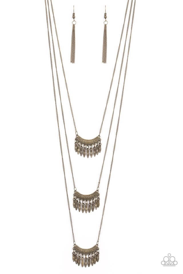 Infused with beaded brass fringes, floral embossed brass frames layer down the chest in a whimsically stacked fashion. Features an adjustable clasp closure.
