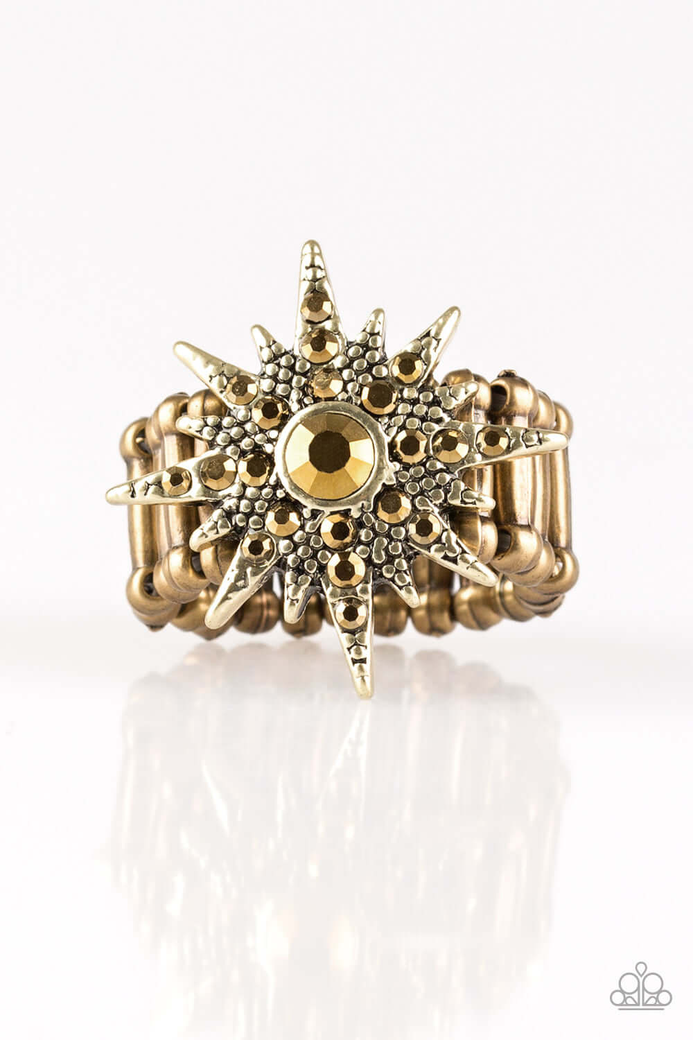 Radiating with aurum rhinestones, a brass star-like frame bursts across the finger for a stellar look. Features a stretchy band for a flexible fit.