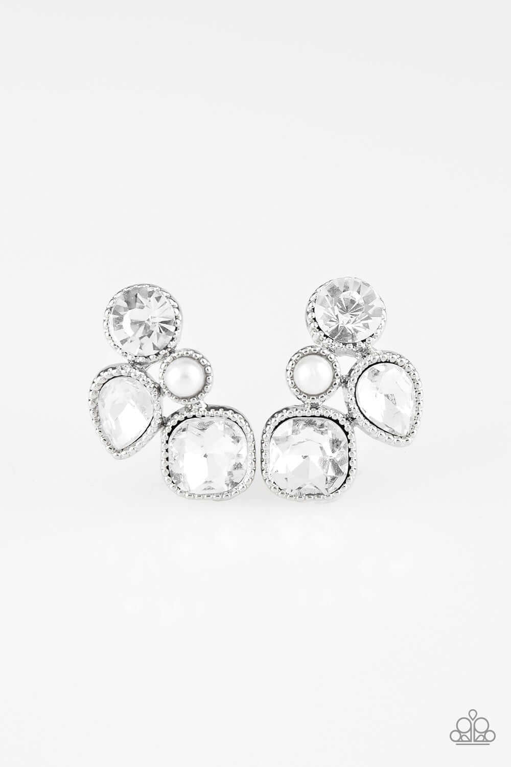 Infused with a dainty white pearl, mismatched white rhinestones coalesce into a glittery frame. Earring attaches to a standard post fitting.