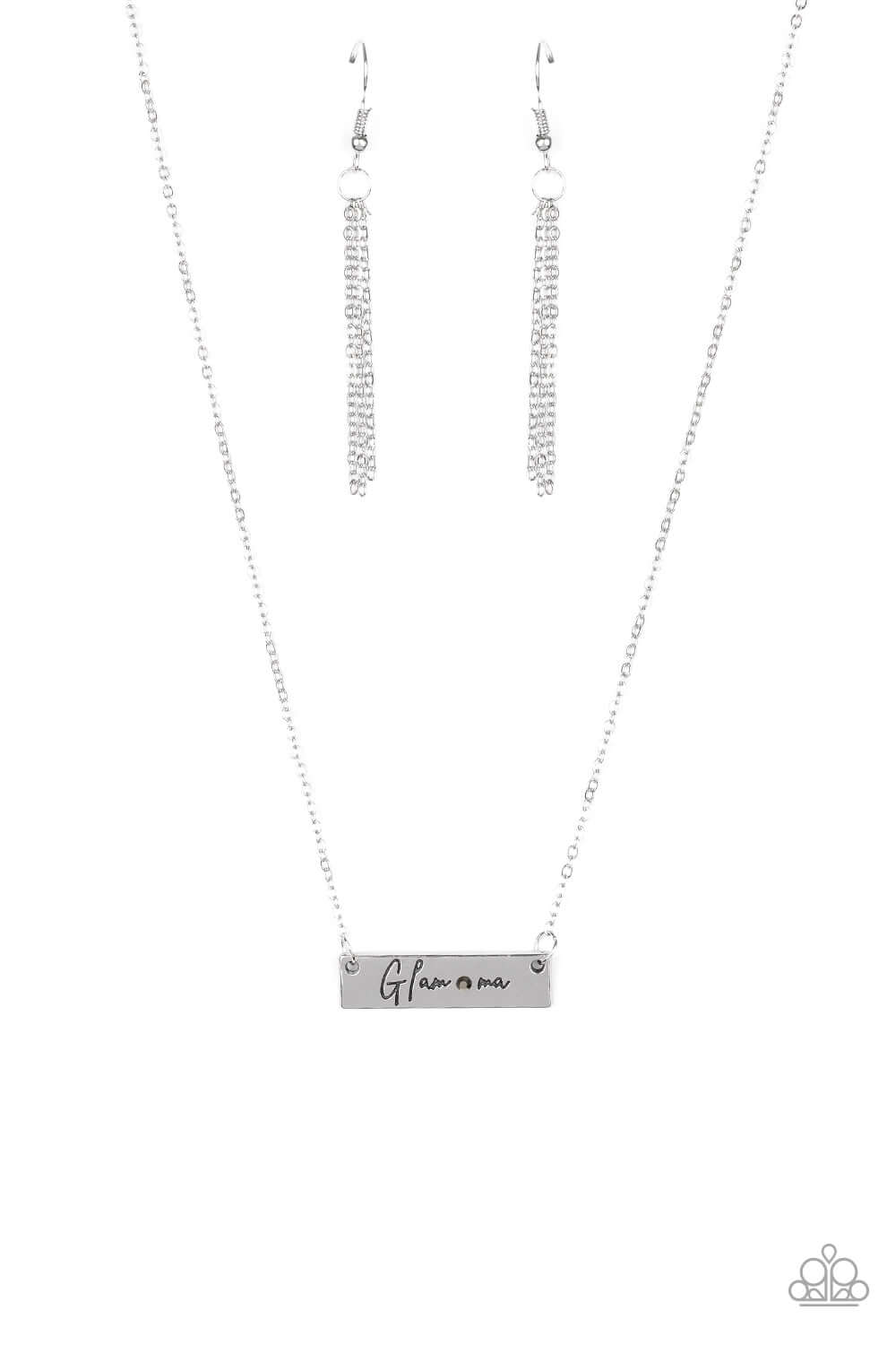 Dotted with a dainty hematite rhinestone, a silver rectangular frame stamped in the sassy word, "Glam-ma", is suspended below the collar by a dainty silver chain for a glamorous look. Features an adjustable clasp closure.