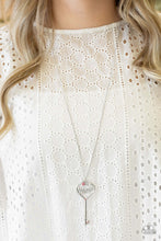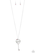 Dotted with dainty iridescent rhinestones, glistening silver filigree spells the word, "Mom", inside a heart-shaped key. Infused with a glittery pink rhinestone and white crystal-like heart, the airy pendant swings from the bottom of a lengthened silver chain for a charming look. Features an adjustable clasp closure.