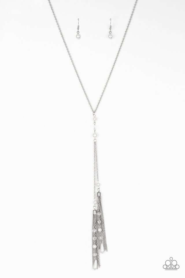 Dainty silver pearls and sparkling white crystal-like beads gives way to two shimmery silver chain tassels. Infused with ornate silver beads, strands of matching beads trickle down the tassels for a refined flair. Features an adjustable clasp closure.