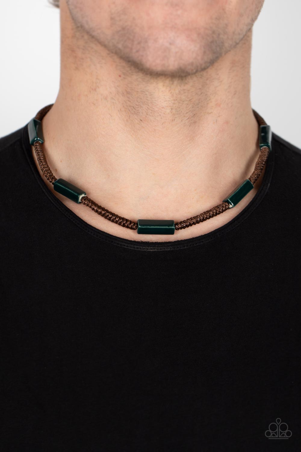 Glazed in a shiny green finish, rectangular ceramic beads are knotted in place along braided brown cording below the collar for a colorfully urban look. Features a button loop closure.