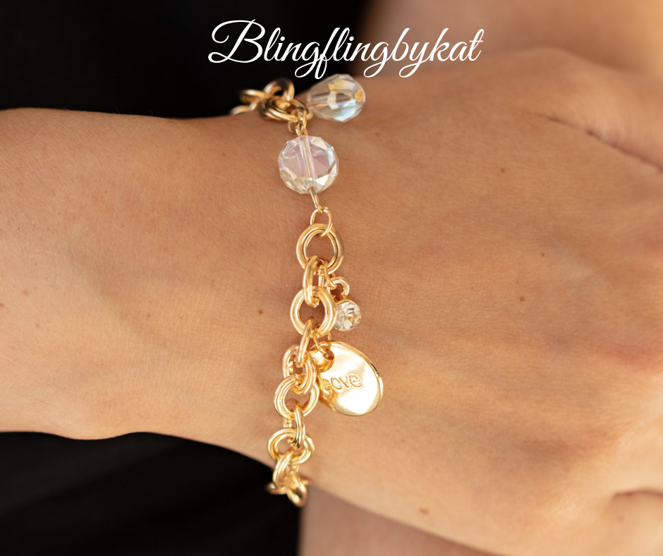 White crystal-like beads, a dainty white rhinestone, and a gold disc stamped in the word, "love," adorn a double-linked gold chain, creating a flirty fringe around the wrist. Features an adjustable clasp closure.