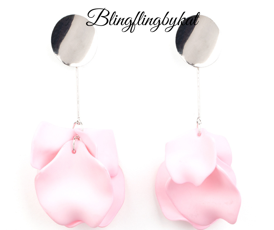 Curving pink acrylic petals dangle from the end of a bar attached to the bottom of a delicately bent silver disc, creating a colorfully clustered lure. Earring attaches to a standard post fitting.
