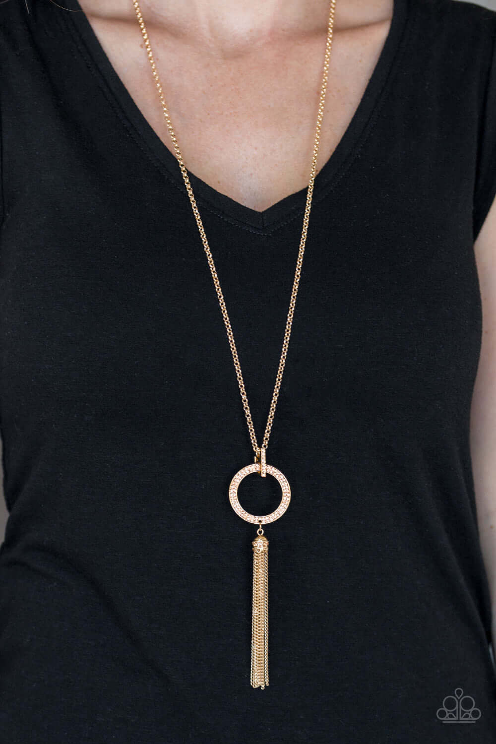 Encrusted in dazzling peach rhinestones, a shimmery gold hoop swings from the bottom of an elegantly elongated gold chain for a refined look. A glistening gold tassel swings from the bottom of the glittery pendant for a flirty flair. Features an adjustable clasp closure.