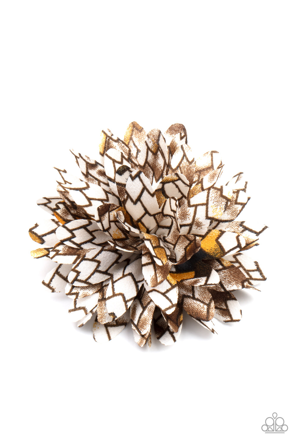 Featuring yellow accents, the petals of a bouncy blossom are printed in an abstract geometric pattern for an artsy look. Features a standard hair clip on the back